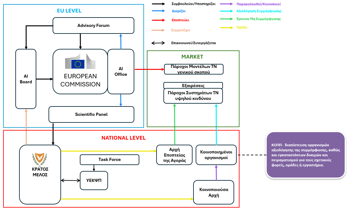Σε εθνικό επίπεδο, κάθε κράτος μέλος, όπως η Κύπρος, είναι υπεύθυνο για την εφαρμογή, εποπτεία και επιβολή του AI Act.